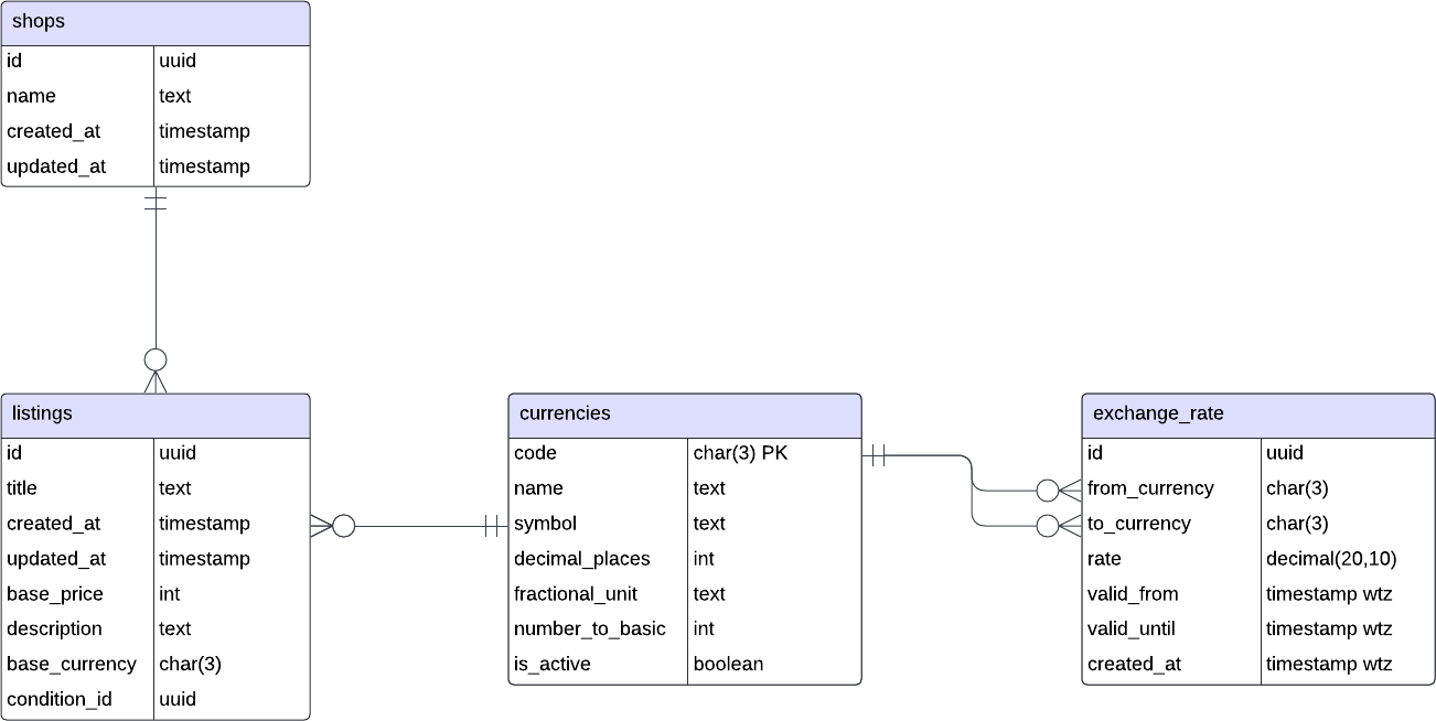 This ERD shows the relationships between the currencies, exchange_rates, and listings tables. The exchange_rates table is the bridge between the currencies and listings tables, allowing us to convert prices between currencies.