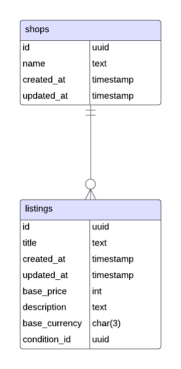 This is a very simplified version of the database. The shops table represents the shops that can list items. The listings table represents the items that are listed.